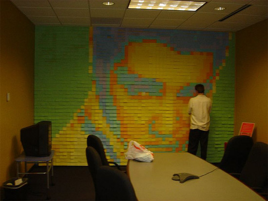 看到這裡不要以為便利貼只能拿來惡搞,只要花點心思便利貼也可以變成藝術喔!看看這個公司員工就發揮巧思,用便利貼完成了一副貓王的馬賽克圖案喔!酷~